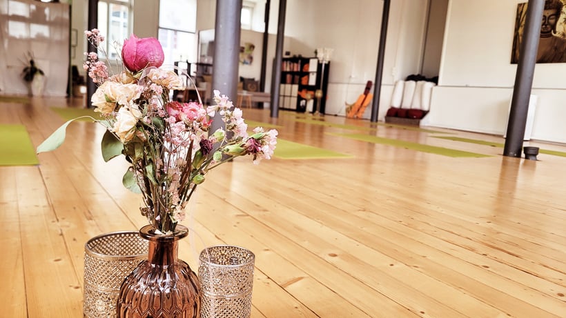 Der grosszügige Yogaraum, durchflutet von natürlichem Licht, bietet den idealen Raum für deine Yoga-Praxis, während der gemütliche Klangraum eine einladende Umgebung für tiefe Entspannung und Regeneration schafft.